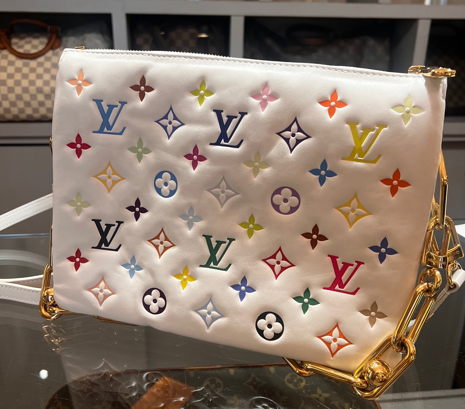Louis Vuitton Borsa Coussin PM pelle agnello bianca in edizione limitata Murakami